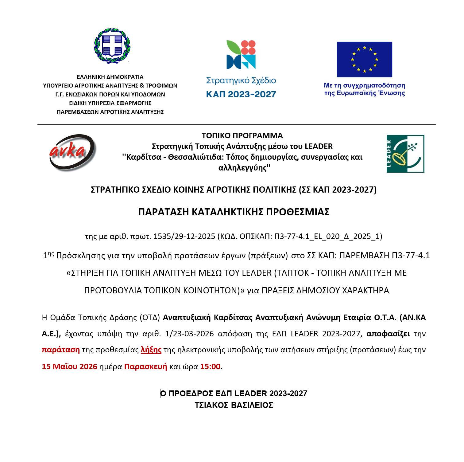 Παράταση καταληκτικής προθεσμίας 1ης Πρόσκλησης (αρ. πρωτ. 1535/29-12-2025 - ΚΩΔ. ΟΠΣΚΑΠ: Π3-77-4.1_EL_020_Δ_2025_1) για πράξεις Δημοσίου Χαρακτήρα