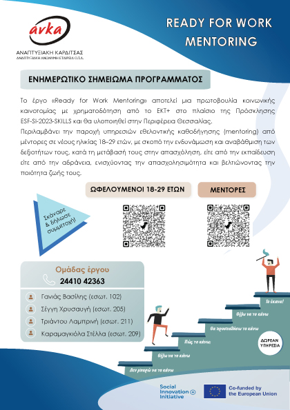 Το Ready for Work Mentoring είναι ένα δωρεάν πρόγραμμα καθοδήγησης στη Θεσσαλία (δια ζώσης ή online), που σε βοηθά να: